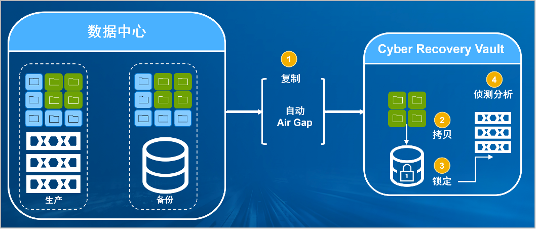 韦德国际1946防勒索病毒方案将生产中心备份数据复制到Vault区,复制后网络自动断开实现弹性隔离。Vault区的数据快速拷贝,并对拷贝版本加锁(在锁定期数据不允许删除和修改)。Vault沙箱内对拷贝版本进行扫描分析,验证数据是否完好。